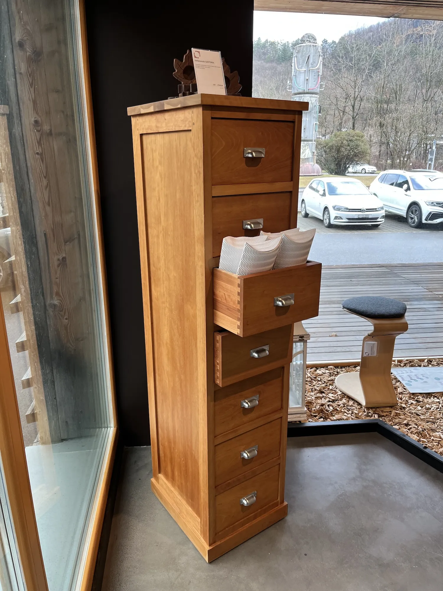 Settimanale in ciliegio oliato naturale, maniglie a conchiglia in ottone, 7 cassetti