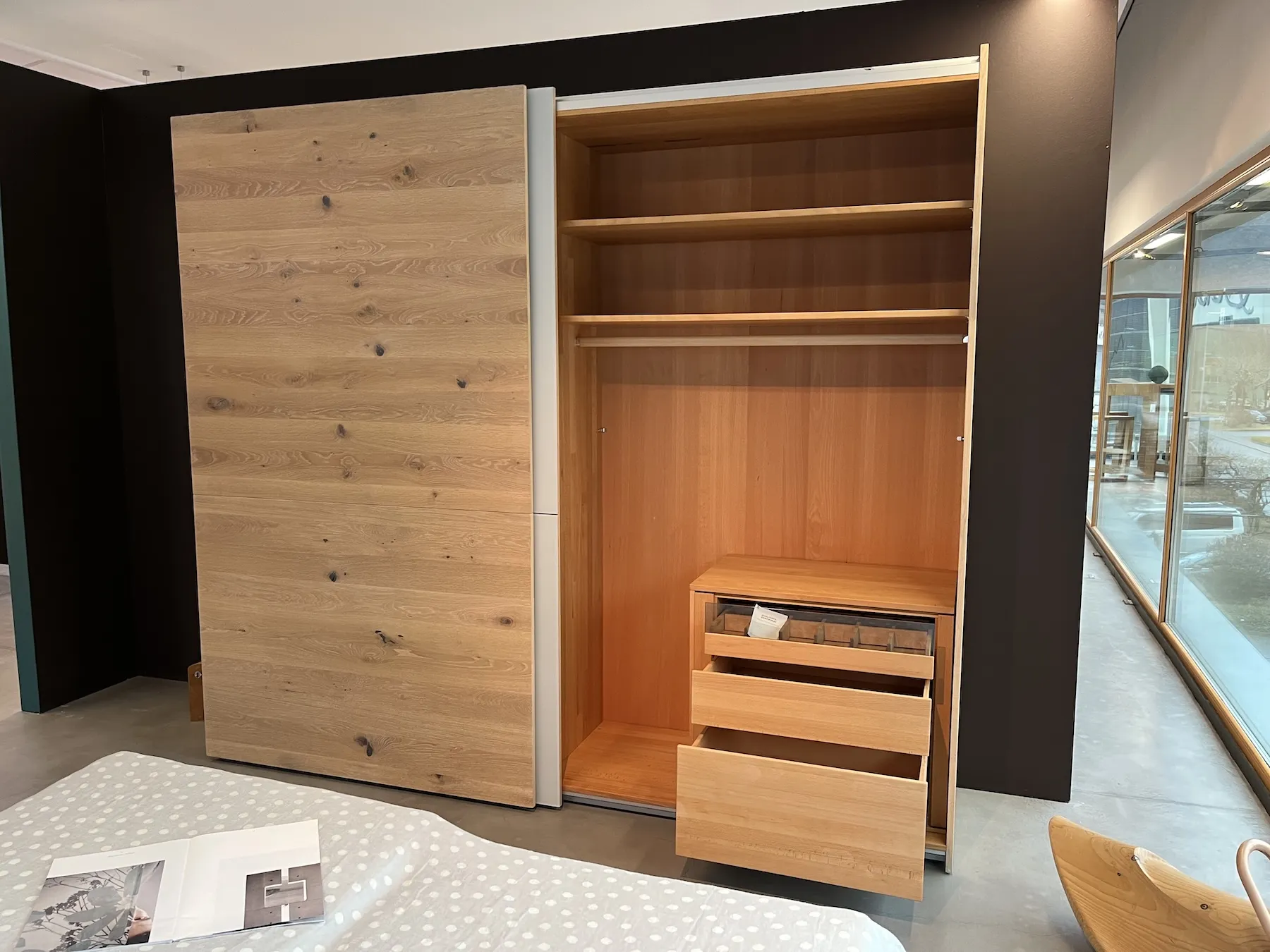 Armadio 2 ante scorrevoli, 1 anta in rovere oliato bianco venatura orizzontale, 1 anta in vetro grigio chiaro. Interno armadio a sinistra: inserto T.