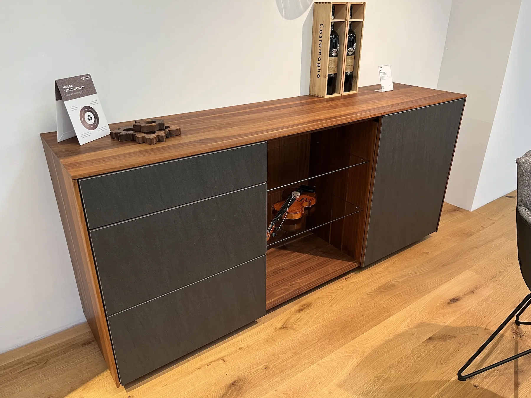 Madia in essenza noce oliato naturale, 3 cassetti Push e 1 anta scorrevole con fronte in ceramica Basalt Black vano a giorno con 2 ripiani in vetro